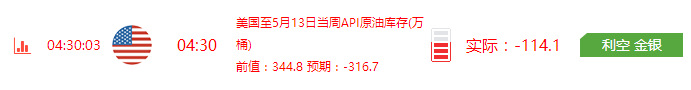 北京时间4:30,API公布上周原油库存,数据显示,截至5月13日当周,美国原油库存录得减少114.1万桶,至5.419亿桶,分析师预计为减少316.7万桶;库欣原油库存则增加50.8万桶;美国上周汽油库存减少189.9万桶,预期为减少66.7万桶;美国上周精炼油库存减少200万桶,预期为减少25万桶。数据没有较大的影响,早间美原油价格小幅高开。