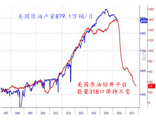 美国能源信息署(EIA)的数据显示,上周美国原油产量下降1.1万桶/日,将至879.1万桶/日,为连续第10周减少,并录得2014年9月上旬以来的最低产出水平。