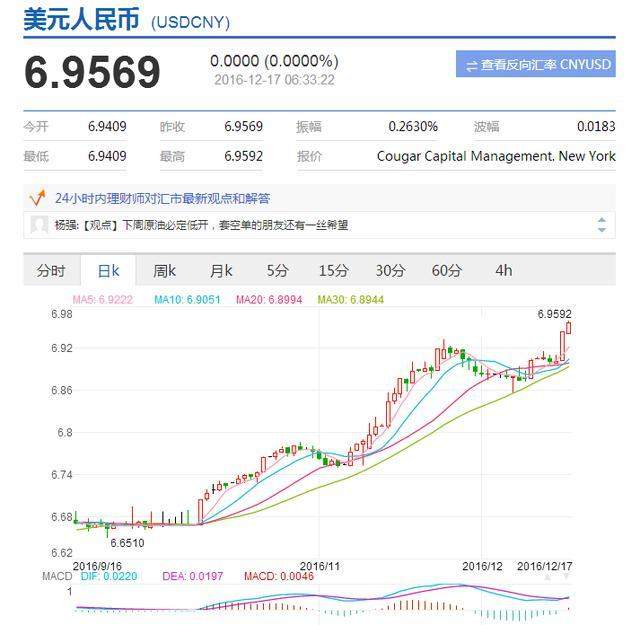 近日、美联储悬在空中的一只“靴子”终于落地、本月15日凌晨3时、美联储公布议会决议、宣布加息0.25、就在当时、全球货币暴跌、大宗商品暴跌、股市暴跌、债券暴跌、金融市场任何领域无不被血洗、此时、人民币兑美元已经向7:1涌去、人民币现报6.9569:1美元!