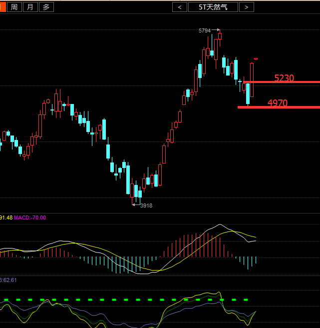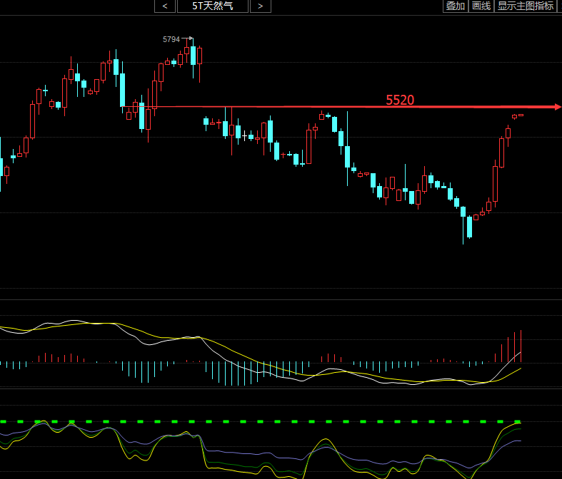 从日线图来看,天然气已经单边接近300点,行情已经出现了超跌反弹的迹象,预示着下方的空间不多,在周二收大阴探底5000后大幅反弹目前5493一线,收取大阳K线作为周四EIA的祭奠!