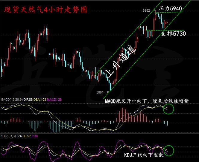 天然气从四小时来看,均线有拐头向下回落的迹象,MACD死叉,绿色动能柱增量,KDJ三线向下发散,目前价格运行于四小时布林上轨与中轨之间,近期行情高点逐渐抬高,昨日再出新高点,说明多头还是比较强的,但也要关注技术面的回补修复,上方压力5940,下方支撑5730,操作上我们仍以回调做多为主。