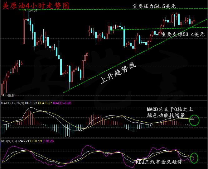 原油从四小时走势图来看,在EIA利空的影响下,油价没有出现较大回落,说明多头依然坚挺,上行通道仍保存完好,上方压力54.51美元,预计短期内将完成该点,不过预计今年希望不大,只等来年再战。支撑依旧关注53.4美元。从指标来看,布林带通道缓慢上行,K线回落至中轨上方反弹,附图MACD指标快慢线死叉下行,绿色动能柱微幅放量,综合来看,短期内油价有回落需求,日内笔者看好触底反抽,晚间收到支撑再以低多为主。