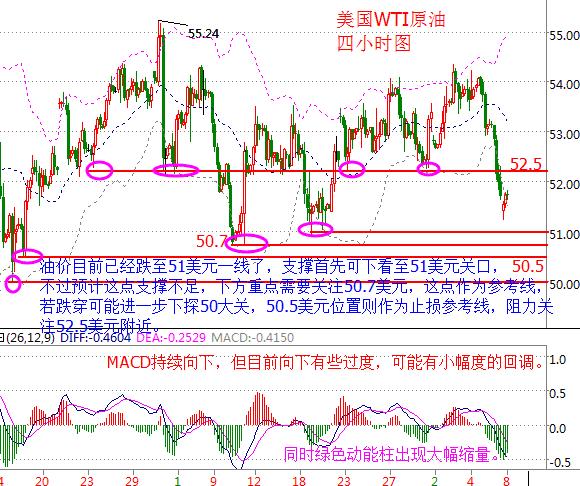 美国WTI原油从四小时走势图来看,油价目前已经跌至51美元一线了,支撑首先可以看向51美元关口,不过预计这点支撑不足,下方重点关注50.7美元,这点作为参考线,若跌破则可能进一步下探50大关,50.5美元则作为止损参考线,阻力关注52.5美元附近。