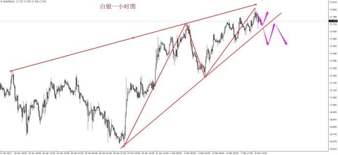 受美国数据影响,白银昨天也是大幅下跌,从机构持仓看,CFTC报机构已连续5周增持,反映出市场看多氛围正在凝聚。从金银比值走势看,虽然经历了几个月的横盘振荡,但总体下行趋势不变。这意味着拥有更强工业属性的白银将更抗跌,上行空间也将更大。技术面上,白银一小时形成倾斜向上的收缩三角形,昨天破位回踩之后继续下跌。白银日内重点关注17.4位置的支撑,上方17.8位置的阻力。