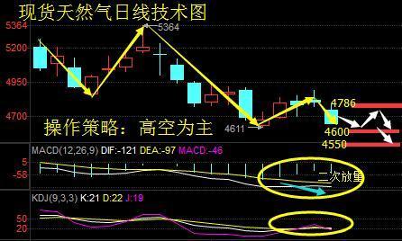 从四小时图来天然气单边性下跌跌破布林带下轨位置,下方受4600一线支撑,MA5/MA10日均线持续死叉进一步压制天然气上行,附图MACD指标在0轴下交死叉运行,绿色动能放量不断加强,KDJ三线相交缓和运行,CCI自下向上处于常态区间。短期技术形态上看有反弹迹象,但整体依旧处于空头趋势,所以对于天然气走势建议高空为主。上方重点关注4700一线压力位,下方关注4600附近位置支撑。