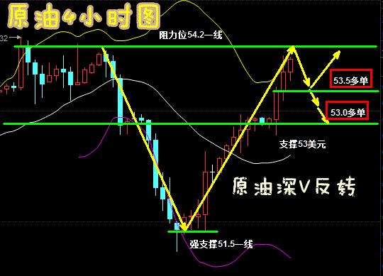 操作策略二:53.0——53.2附近布局多单,目标53.8——54.3,止损0.5;