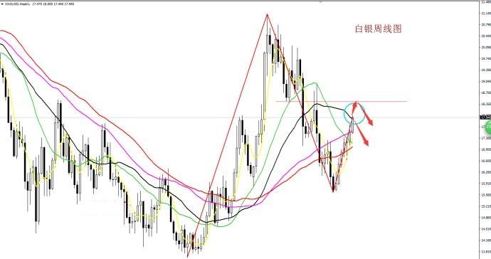 白银周五晚盘大幅拉升,拉升速度明显大于黄金的波动,最高刚好到达18的位置,日线以大阳线报收,白银周线连续以阳线报收,周线已经是7连阳的走势,上周白银周线开盘价17.4,收盘价17.9,周线形态以大阳线报收。白银18价位是重要阻力,从趋势方面上看,白银上升趋势没有改变,下周操作仍是以逢低买入为主,但需注意下周耶伦讲话来袭,由于美国经济数据华丽,耶伦言论可能会偏向鹰派进而支撑美元继续反弹,下方关注17.4附近的支撑,上方关注18.5价位的阻力。