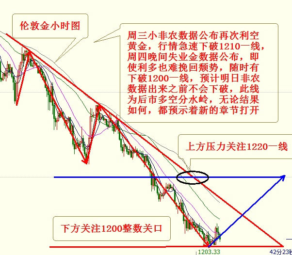 伦敦金小时图上可以看到,自本周一以来延续上周跌势,丝毫没有反弹迹象,周三小非农数据利空再次引爆行情直接拉闸,周四虽说失业金数据利多金银,也只是小幅度的止跌,不过从技术面来看,黄金目前已经跌到了下方关键支撑位1200一线,此线为多空分水岭,后市行情将在此处展开。