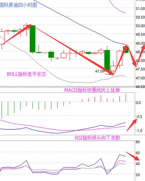 国际原油从四小时走势图来看BOLL指标走平状态,K线指标处于布林带下轨通道内,下方空间有限,并且MACD指标快慢线向上延伸,动能红柱增量,但RSI指标拐头向下发散,短期内多头力量不足。综合来分析预计后期行情先回落再上涨。
