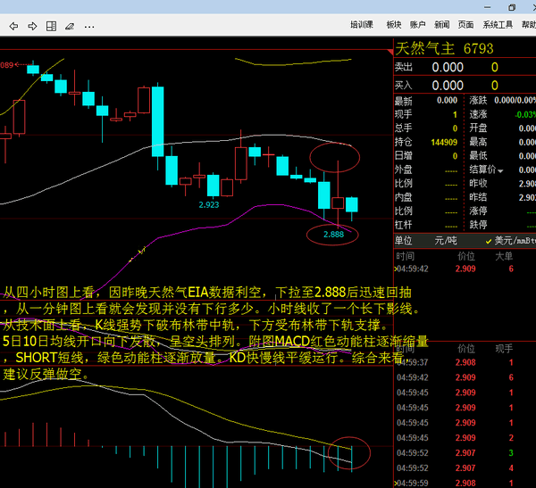 天然气方面:从四小时图上看,因天然气EIA数据利空,下拉至2.888后迅速回抽,从一分钟图上看就会发现并没有下行多少。小时线收了一个长下影线。从技术面上看,K线强势下破布林带中轨,空头来临,下方受布林带下轨支撑。5日10日均线开口向下运行,呈空头排列。附图MACD红色动能柱逐渐缩量,SHORT短线,绿色动能柱逐渐放量。KD快慢线平缓运行。综合来看,建议反弹做空。
