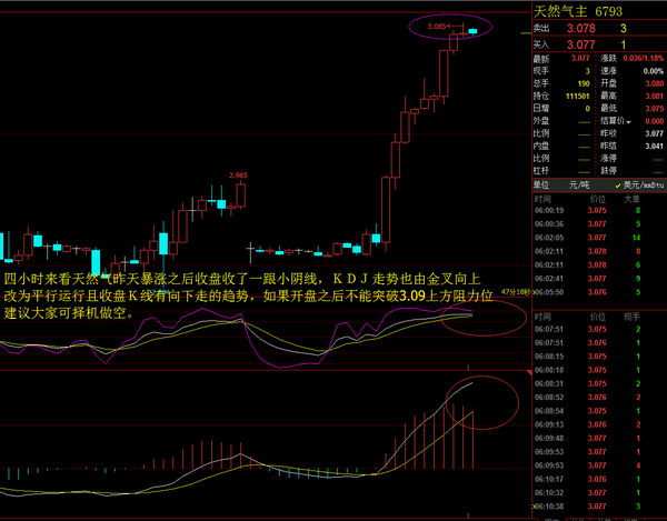 上周五小幅的上冲后今日天然气开盘便大幅的跳空,这明显的是诱空的行情;亚欧盘慢涨,美盘多头暴力拉升,本人布局的低位多单也已成功止赢出局;四小时来看天然气昨天暴涨之后收盘收了一跟小阴线,KDJ走势也由金叉向上改为平行运行且收盘K线有向下走的趋势,如果开盘之后不能突破3.09上方阻力位建议大家可择机做空,天然气波动较大具体操作私聊天易老师。