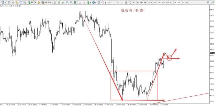 原油昨日回落试探50一线支撑,随后继续开启拉升模式,近期文章多次提示,原油已经筑底,并且突破50一线阻力,也就预示着后市将会继续走高,今日早盘的API数据录得减少,将会助推油价进一步走高,从技术面来看,原油四小时线圆弧底,三次探底47都未能跌破,下方支撑较强势,昨日日线继续收阳,也就是今日破新高的可能性加大,重点关注晚间的EIA数据,日内操作上以高空低多即可,下方50.6一线支撑,上方关注52一线阻力。