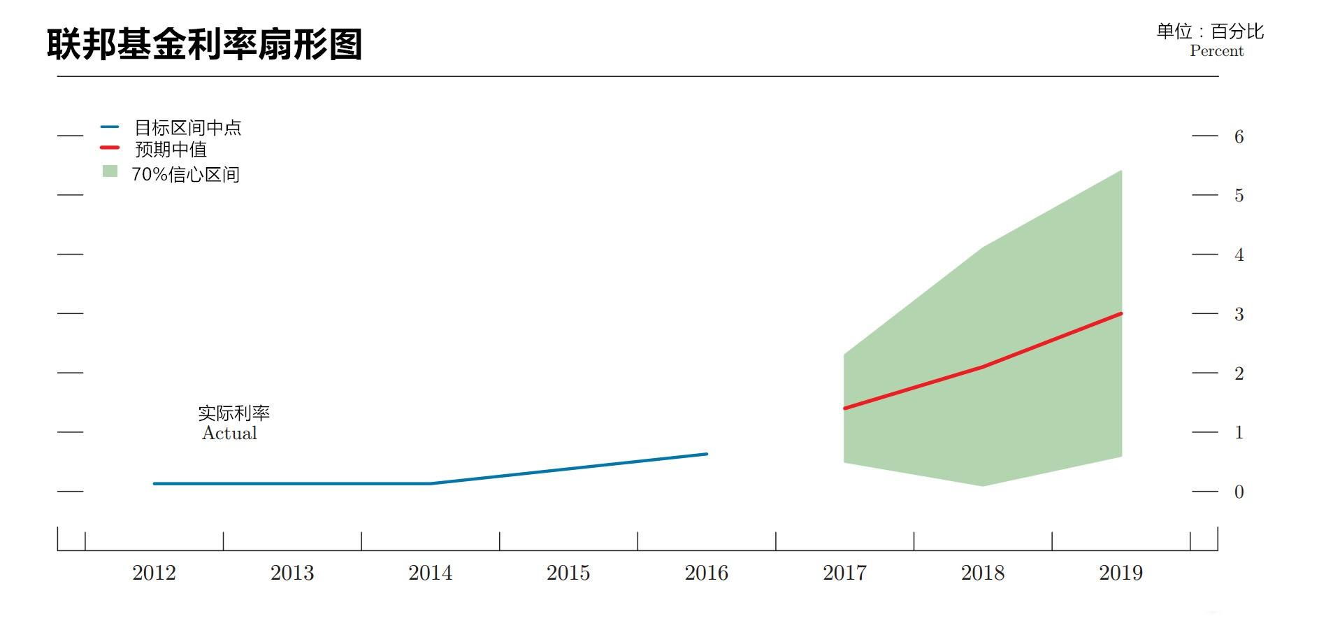 昨晚会议纪要显示,美联储维持2017年共加息三次的预期不变,委员们支持循序渐进地加息;另外,大部分官员认为今年晚些时候有理由开始缩减动产负债表,但未指明具体时点。此外,会议纪要首次公布了“扇形图”,用以展现美国联邦基金利率的不确定程度。根据扇形图,FOMC有70%的信心认为,2017年联邦基金利率在1.63%-2.87%区间内,2018年2.13%-4.12%,2019年2.88%-4.12%。