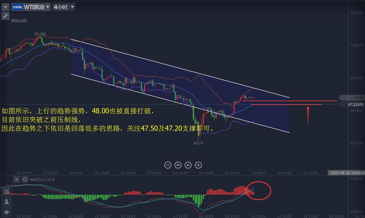 小时线,美原油昨日的整体走势相对放慢节奏,最高点也只是在美盘时间段的一波上行至48.20附近后的进一步回落中,最终是在布林带中轨一线完美收盘,但是昨日的原油策略涨笔者刘天易也是明确给出单边性的多单建议,从最终势头来讲多头是没用问题的。目前来说MA5和MA10均线都是一个聚集中轨形态,且布林带三轨也由之前的张口在昨日的冲高回落中表现紧缩持平现状,因此就当前小走势来说,刘天易认为美原油的上行势头有所减弱,目前来看有短期的回调表现,那么就需要及时关注布林带下轨所在支撑位即可。