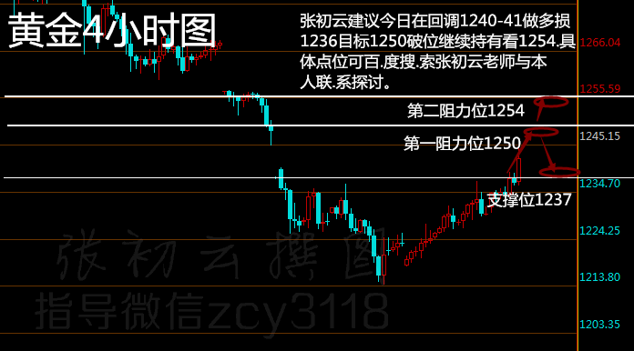 短线图:小时图台阶慢涨还算稳固,经过昨日的横盘整理突破了4小时下行趋势线的压制,同时坐稳1235.50顶底转换口。打破了此前的弱势格局,短线反转成功。同时台阶上升临界点由昨日的1230直接上移至1236.短线而言只要不下破1236保持低多思路仍为首选。慢涨行情虽然伴随回调,但也会慢慢收复失地。不宜过早看空。以免想着多空通吃,最后多空通失。既然趋势结构看多,首先还是找点位去做多为主。支撑在1240一线。张初云建议今日在回调1240-41做多损1236目标1250破位继续持有看1254.具体点位可百.度搜.索张初云老师与本人联.系探讨。