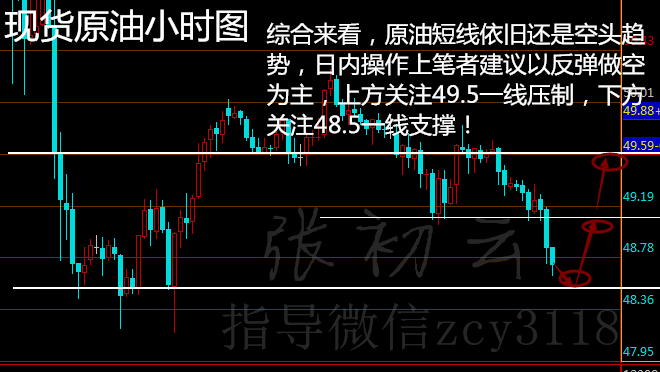 目前从技术面上来看,日图布林带开口向上,K线在布林带中上轨间交投于MA5附近,MA5拐头向下穿MA10交死叉,幅图指标MACD金叉放缓红色动能缩量,KDJ三线死叉向下发散,行情整体空头占优;4小时图上,布林带下行逐步缩口,K线在布林中上轨之间受布林中轨支撑,MA5下穿MA10交死叉下行,且MA10一定程度压制油价上行,幅图指标MACD快慢线粘合运行指标中性,KDJ三线向内聚拢行将粘合运行,油价在隔夜尾盘小幅反弹后依旧承压回落,上方受压制明显,反弹动能不足行情依旧呈现弱势下行。综合来看,原油短线依旧还是空头趋势,日内操作上笔者建议以反弹做空为主,上方关注49.5一线压制,下方关注48.5一线支撑!有套单在手的投资者或关于做单技巧学习可与张初云老师薇工重号交流获取。