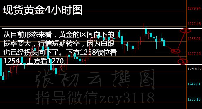 黄金,震荡行情也有涨跌,前面从1274开始回落,昨晚本来ADP数据利空打压,但隔夜并没有跌破1259周低点,而是再次反弹到1268,行情相对来说比较反复,但注意早盘,价格直接回落了下来,貌似已经开始了小时线的震荡下行走法,在非农之前开始下跌并不是不可能,昨天行情就很惊险,虽然隔夜反弹,但短期空头逐步占优,只是调整是震荡式的,持有昨晚1265的空单,数据利空,行情跳空下跌后做的空,持有过夜到现在,手里没单的早盘找位置继续干空进去,区间前面已经给出来,1255一带是行情的支撑,如果白天就开跌,那我们赚一笔再去做非农,从目前形态来看,黄金的区间向下的概率要大,行情短期转空,因为白银也已经拐头向下了。有套单在手的投资者或关于做单技巧学习可与张初云老师薇工重号交流获取。