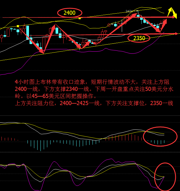 4小时图上布林带有收口迹象,短期行情波动不大,关注上方阻力2400一线,下方支撑2340一线。下周一开盘重点关注50美元分水岭。以45—65美元区间把握操作。上方关注阻力位,2400—2425一线,下方关注支撑位,2350一线;