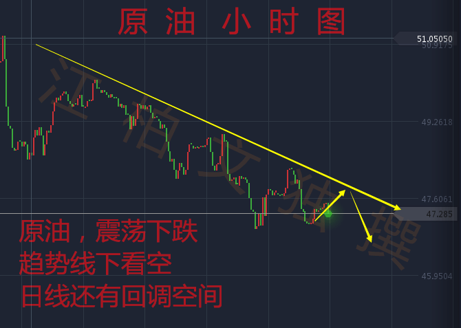 原油,调整从52开始算到现在47,跌幅也不小,刚开始日线大跌后还反弹,上周则从50开始震荡下跌,小时线和日线已经有了趋势下跌的雏形,连接上周高点50.3-49.1,阻力刚好就是昨天高点48.4位置,不过当时中东四国宣布与卡塔尔断交,导致小时线拉升比较急,当时选择了避开这波上升,所以后续错过了空单,不过整个从上周50.3开始的下降趋势还在,现在操作依然围绕趋势线来进行,实时布局联系江柏文微-信jbw135,另外昨天反弹48.4下跌,美盘没有刷新上周低点,日线虽然收阴,但空头压制没有那么强,这一点值得注意,空头后期,到了由空转多的时候,往往就是从这里开始的,短线依然看日线高点阻力做空,因为周线压制相对较强,所以正常来说,这周应该还有下跌空间;日内走势,美国原油48空,止损48.5,目标47!