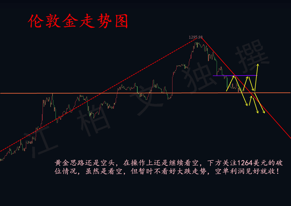 伦敦金多单策略:小周期中出现小垂线,预计短期会有一波小幅反弹,激进者可现价布局一次多单,目标看1268-70;此单为激进单,短线持有!稳健者首次回撤1258附近布局多单,目标看1268一线,如欧盘破1270,需调整思路,回撤反手再多;