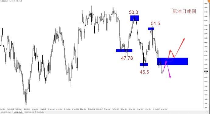 原油从日线级别来讲,目前价格位于44.68一线,此处位于布林带下轨了,同时昨日收阳线,组成了一个看涨吞没的K线形态,同时RSI位于底部,Stoch底部出现金叉,有反弹的需要,此时我们不能过分的看空,这里随时可能进行大级别的反弹;从4小时图来看,依旧是偏空运行,但是从K线来看,阴线在减小,阳线在不断增加,有筑底迹象,短线将会反弹,从最近的基本面来看,油井在不断增加,导致页岩油的产量不断增加,库存也在增加,这将继续打压油价,下周下方重点关注43-43.7一线支撑位,上方关注46.7一线压力位,操作上周初可以逢低买入。