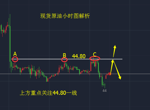 今日原油下探之后必将迎来反抽,而45的位置依旧是我非常看好的点,同时,有的合约今晚交割,这就导致大家不能过夜,但原油的行情几乎也不需要过夜,原有合约在45附近空,而现有新合约则是在44.8一线空,我还是建议继续持有原油的空单,暂时不计划抄底,大的方向我看好空的延续性。后市价格几乎围绕44-45一线展开整理,短期上方承压45.3一线,后市若不能突破此位置晚间预计将会以震荡收场,不过从目前的走势表现来看反弹缺乏动能,日内价格突破试探45位置未果并承压回撤,虽然回踩44.4再次反弹,不过未能持续,所以早间操作上建议还是以空头为主。