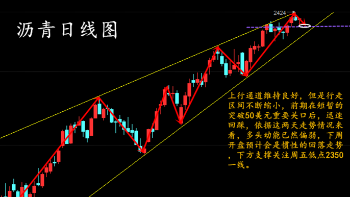 从4小时线上看,5日均线下穿10日均线,布林带缩口,附图MACD快慢线死叉运行,绿色动能柱缩量,随机指标KDJ三线拐头向上运型粘合。综合来看瑾言认为下周一亚盘期间会小幅度上升,然后震荡下行。下周整体会承压下行,操作上高空为主,重点关注2380,2350支撑