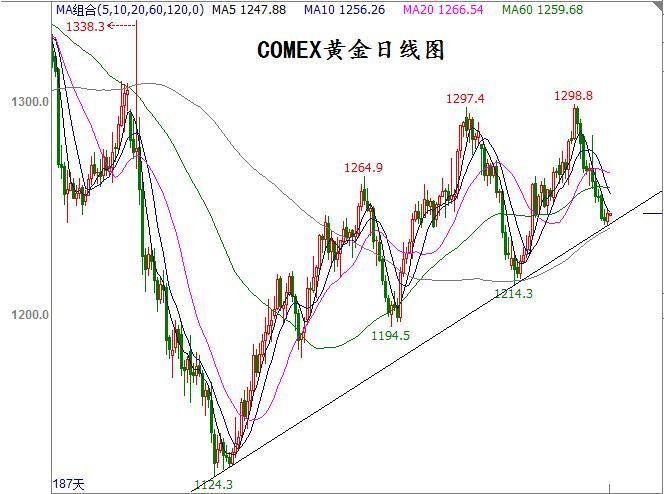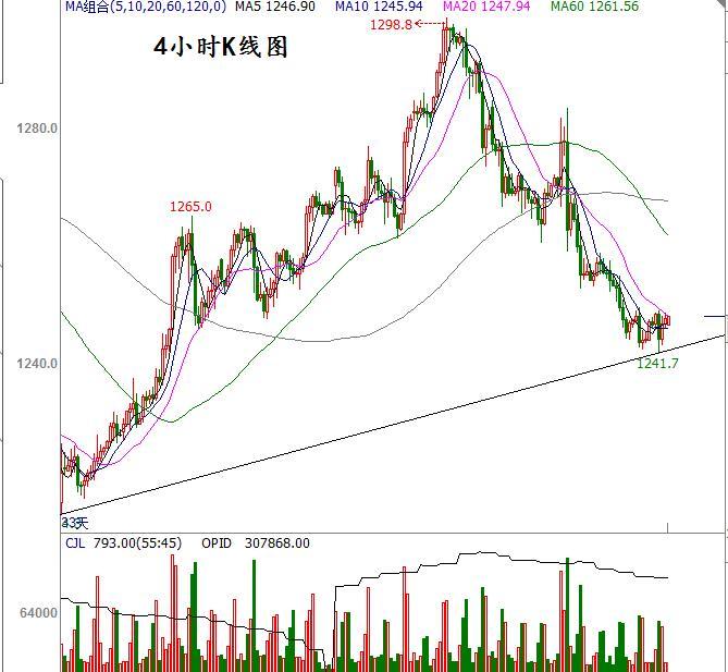 日线走势中,支撑位于120日均线(1240)附近,此线也是周线中关键支撑位,连续2日试探后显示此线支撑较为强劲,K线形态上黄金价格处于上涨趋势中期回调阶段的底部。若跌破此线支撑,上涨趋势将被破坏,金价或短期内触及1200关口。笔者认为目前或是中线多单介入的好时机,不过短期内也存在刺穿支撑的可能。建议参与中线多单的投资者,止损线设置正在1238较为稳健。