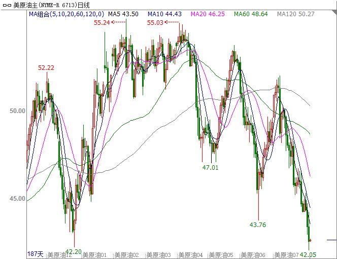 周三(6月21日)原油延续跌势,连续三天下跌,NYME 8月期货合约价格下跌0.85美元或1.91%,收盘报价42.53美元/桶。盘中最低报价42.05美元,创2016年8月11日以来最低价格,市场担忧供应过剩强烈,油价目前 已临近国内“地板价”40美元关口。