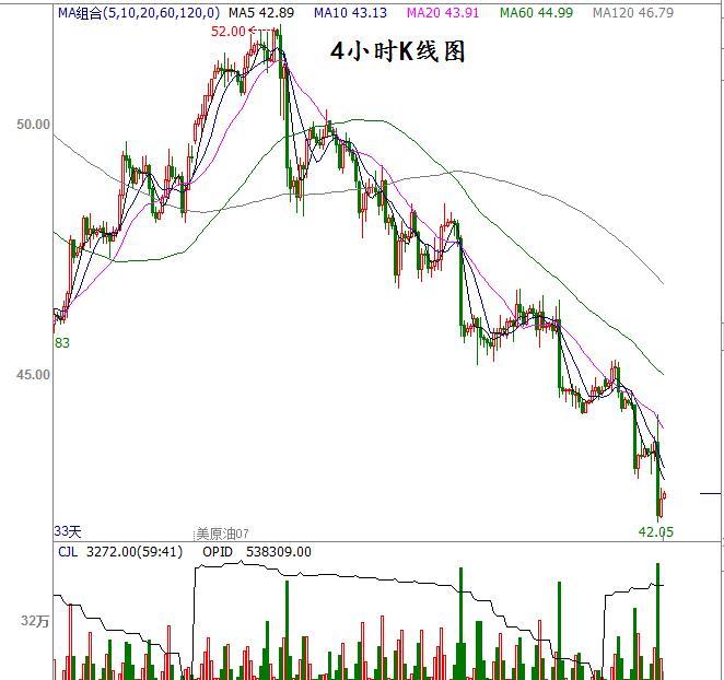 短期走势中,4小时K线图震荡下行,每一次的反弹便意味着新低出现。且每次下跌都带着交大的成交量,笔者认为这表明市场投机者对空头的肯定,看空情绪高涨。亦如昨日文章《原油即将跌至国内“地板价”, 美元强势令黄金跳水》中的44美做空策略,短线思路较为简单:反弹做空即可。