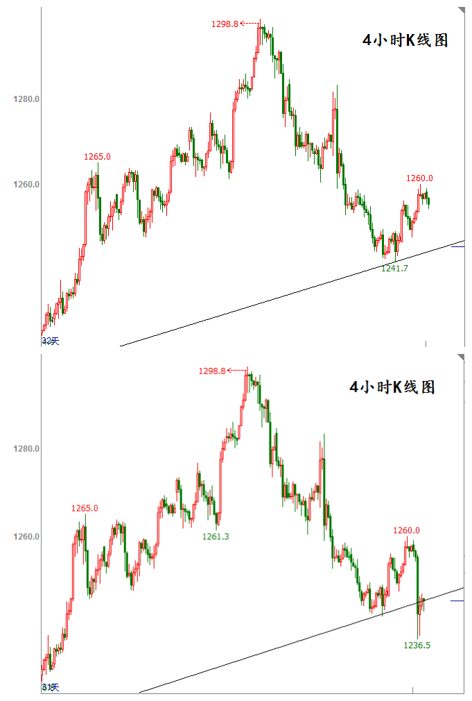 另外,在黄金4小时图中,反弹早已进入疲软阶段。以下是黄金闪蹦前后4小时的对比。黄金在 触及1260价位后多头出现乏力,亚盘阶段回落,那么若是昨日有操作多单的朋友就要思考一下是否问题不在于行情出现意外,而在于自己呢?