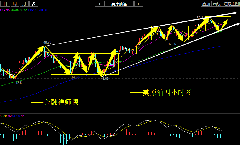 操作需要关注的:首先还是方向问题,日线上昨日收小阴线下跌,今天个人认为还是按高位的震荡走,加上四小时来看,连收6阴线,气势凶猛,尽管这样,我们大方向仍然多头不变。笔者最近几天经常讲的分水岭争夺,昨日成功站上后,又意外失守了,周五再次关注分水岭区域49.40-49.60,;最后周线收官,加上黑色星期五,在操作上还是建议谨慎对待,只要没有下破48.30的区域,还是非常强势,尤其周线收线会为后市突破51奠定了基础。后市需继续重点关注48.90的破位情况。