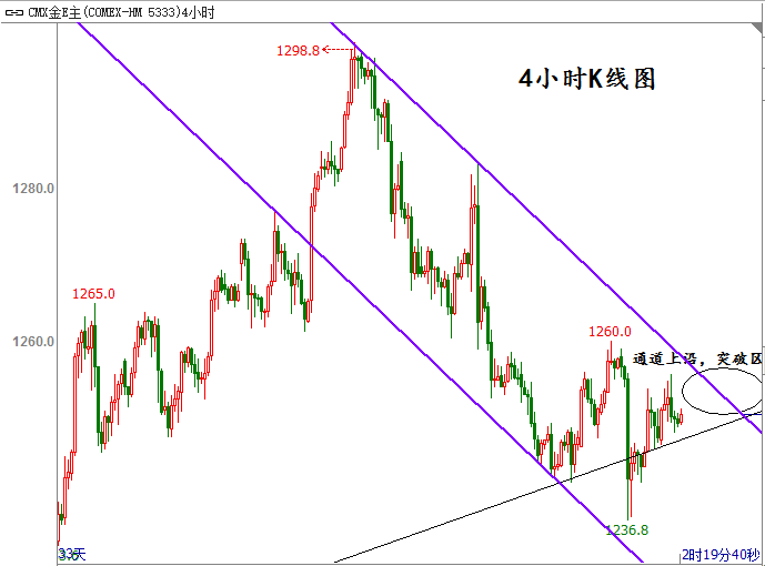 从日线走势看,黄金处于上升通道的底部,也即前面文章多次提到的重要支撑,随着时间的推移,通道以及支撑也在不断上移,目前支撑价格位于1247-1245美元区间。短线走势上黄金价格虽有所反弹但依旧运行在4小时周期的下行通道中,而涨势成立的关键在于突破短期下行通道的上沿。