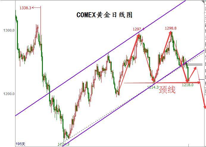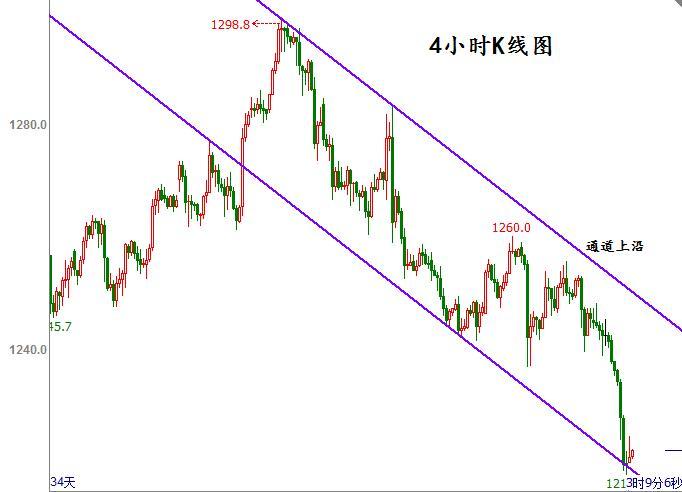 从日线上来看,黄金1297.4与1298.8形成M双顶,目前价位已触及1214.3颈线附近,预计行情将出现反抽,依托此线做多较为妥当。另外4小时走势中,K线触及下行趋势通道底部也是极好做多的位子。综合看日内依托支撑1218,1214做多,若行情出现筑底可作为中长线持有。