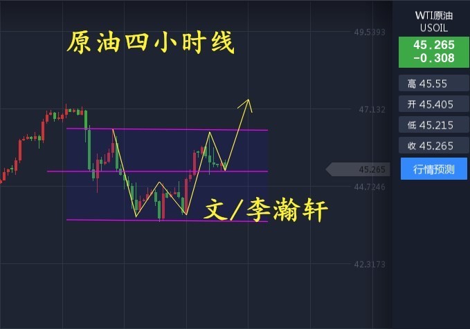 从昨日的表现来看46.7下方的双顶压制下,日线冲高走回落大阳转阴线,而上升的行情中价格一旦难以再次突破阴线的顶部,那么短期的反弹又将告一段落;行情还需回撤确认支撑后才能更进一步。前期同样的是价格三次确认了下方44关口的支撑之后,价格才打破短期的震荡拉锯,一举站上45美元强阻关口,而45由压制形成了转换后的支撑位。另外昨日价格虽冲高回落但是未能触及45美元关口,价格随即再次反弹回升46美元,而大幅下调后的反弹也成为了行情的修正,但是价格依旧在45美元关口上方形成了明确的支撑,那么今日依然可以在45附近布局多单,止损44.7,短期目标看45.5-45.8一线。