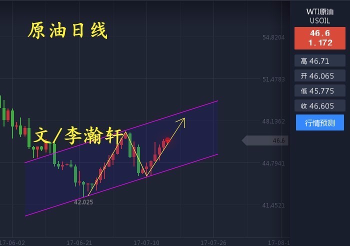 原油本周的走势就是;冲高回落,止跌反弹,最终还是保持多头攀升。本周原油上涨一方面是由于上周三连阴出现短期的破位情况致使空头回补,其次就是API以及EIA数据库存大降提振油价上行动力。虽然中期出现诸多利空因素,但并不能完全打压其多头趋势。从隔夜“洗盘”的行情走势看油价收于46.5美元偏上方,可见多头强势。消息面上我们仍要关注美国页岩油增产情况以及OPEC减产有关动向。而目前整个市场都在密切关注OPEC产油国油长将和非OPEC产油国代表俄罗斯在7月24日于俄罗斯举行会谈,届时将讨论当前的油市状况,至于能否带好利好还有待观察。