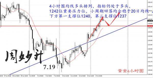 日内黄金上破200日重要均线压力,MACD指标底部金叉,KDJ指标底部背离向上,4小时图均线多头排列,指标仍处于多头,1242位重要压力位,小周期回落均企稳于20日均线 。下方第一支撑位1240,第二支撑位1237。