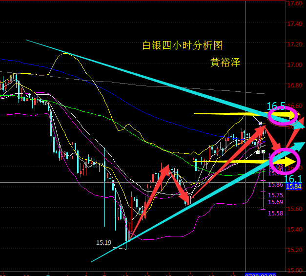 技术资讯:白银日线图上来看,K线昨日收取了一根十字星,K线价格运行在布林带中轨附近,布林带开始缩口,K线价格受布林中轨支撑,MA5上穿MA10金叉走势良好,附图指标MACD双线在零轴下方开口向上,红色动能柱放量,KDJ向上发散,整体来看,现货白银走势利好。四小时图上来看,K线上一根收取了一根上下影线阴柱,布林带向上缩口运行,各均线有粘合趋势,附图MACD指标处于零轴上方,快慢线交叉向下运行,绿色动能缩量,KDJ指标三线走平,CCI指标向下延伸,由此可见,后期行情先回落再上涨。从一小时来看,布林带张口运行走平,K线受到布林上轨的压制后回落于布林中轨附近,附图指标MACD双线在零轴上方,红色动能柱缩量,KDJ有向下发散的趋势。综合来看,现货白银短线可能会有回落,然后迎来上涨。注意上方16.5的压制,下方16.1的支撑。操作建议上等待回落做多即可。后续建议请搜索违心公众號:黄裕泽。现货白银操作建议:16.25附近做多,止损16.15,目标看到16.5.