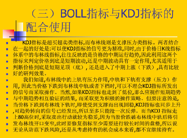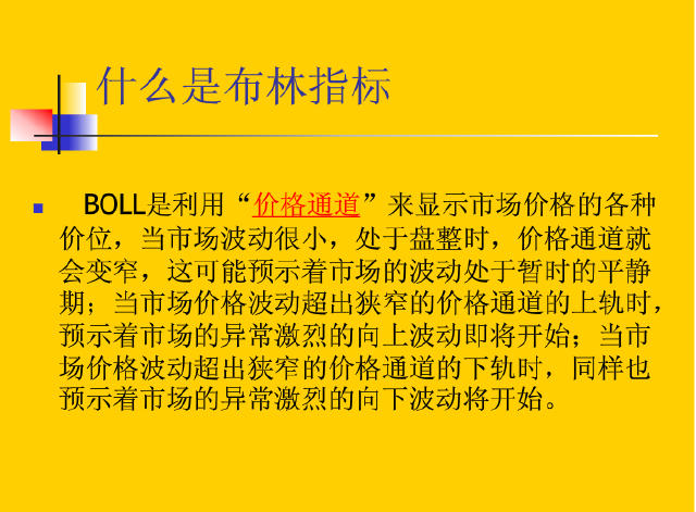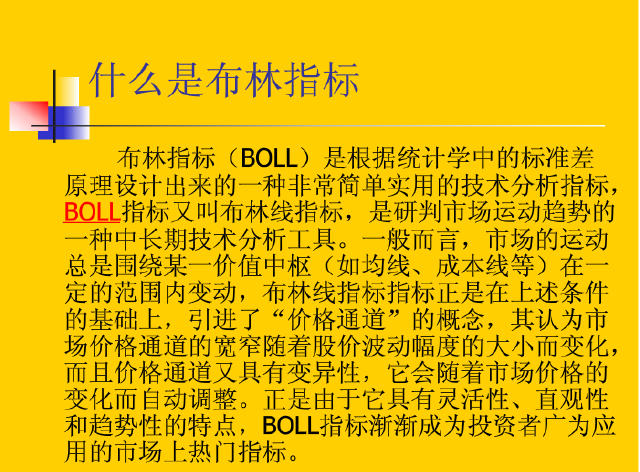 布林指标(BOLL)根据统计学中的标准差原理设计出来的一种非常简单实用的技术分析指标,BOLL指标又叫布林线指标,是研判市场运动趋势的一种中长期技术分析工具。一般而言,市场的运动总是围绕某一价值中枢(如均线、成本线等) 在一定范围内变动,布林线指标正是在上述条件的基础上,引进了“价格通道”的概念,其认为市场价格通道的宽窄随着行情波动幅度大小而变化,而且价格通道又具有变异性,它会随着市场价格的变化而自动调整。正是由于它具有灵活性、直观性和趋势性的特点,BOLL指标渐渐成为投资者广为应用的市场上热门指标。