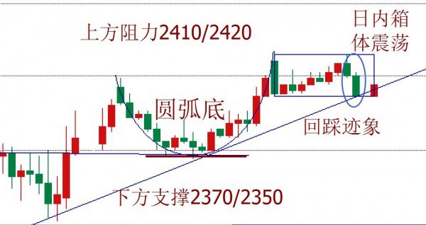 策略二:回调2350-2360布局多单,止损25个点即可,目标看2380-2390;