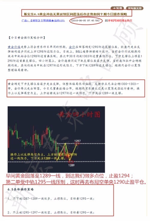 周一的走势分析,也是如预期震荡波动,没有说让人有很大的波动,也是受美联储加息的影响,加息前的黄金波动预计都不会太大!那么对于昨天的黄金走势,靳宏东老师在午间的文章也是实时的分析,在昨天早间《靳宏东6.5黄金冲高无果延续区间震荡后市走势如何?附今日操作策略》中提到不破1289做多,目标1295一线;不上破1295-1297一线做空,看1290一线。在早间开盘黄金上涨至1293一线,没能达到我操作的点位,所以选择了观望,在回调至1290一线时这时我们再布局多单进场,在下午欧盘延续上涨,涨至1294一线时回落,宏东分析短期内无法突破4小时中轨,所以多单选择获利出来;到了美盘还是没能突破,在迟迟没能突破的时候必有回落,在1294附近布局空单进场,在1290附近获利出来。这时时间来到11点,两单获利之后许多人早早就休息,所以午夜暴涨的机会没能抓住。