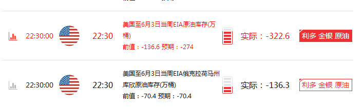 北京时间周三晚22:30,美国能源信息署(EIA)公布的截至6月3日当周原油库存录得减少322.6万桶,预期值为减少274万桶,前值为减少136.6万桶。具体数据显示,截至6月3日当周汽油库存录得增加101万桶,预期为减少67.4万桶,前值为减少149.2万桶;当周精炼油库存录得增加175.4万桶,增幅刷新4月1日以来最大,预期为减少12.5万桶,前值为减少125.5万桶;当周俄克拉荷马州库欣地区原油库存录得减少136.3万桶,前值为减少70.4万桶,降幅刷新4月8日以来最大。