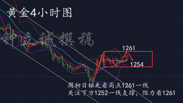 黄金操作建议:回调1252附近做多,止损1247,目标看1260-1262;我们可以看到黄金自1309-1237第三波加速下跌后出现V形反转形态,随后出现一个三角收敛抉择方向的整理形态。黄金自1237反弹1261已经出现24美金的反弹力度,周初目标先看高点1261一线,关注下方1252一线支撑,阻力看1261。