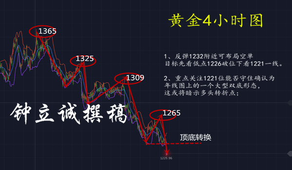 大跌行情,不会强势反抽,如果强势反抽了,那么就不会延续走弱,这一直是我强调的基本思路,日内很多人都在等1236附近的价位,这根本不现实,昨晚破位1236一线后,都没有反抽到1236,只是反抽到1234附近就出现了下跌,所以日内如果从1226反抽到1236,那么就是10美元的反抽了,要延续跌势,那么可能性不会太大,所以给出的思路是在1230下方布局空单,而目前黄金也基本实现了我们的预期,到达了1221一线,离我们的目标也只有1美元的差距,目前来看,行情没有明显的止跌迹象,短线我们暂时不会考虑任何的抄底,因为行情太弱了,没有人知道底部在哪里,所以就不要轻易的去尝试。对于接下来的思路,老师认为如果黄金有反抽到1226附近,我还是建议继续布局空单,总体的思路依然是看空为主。