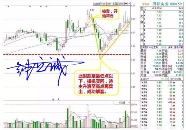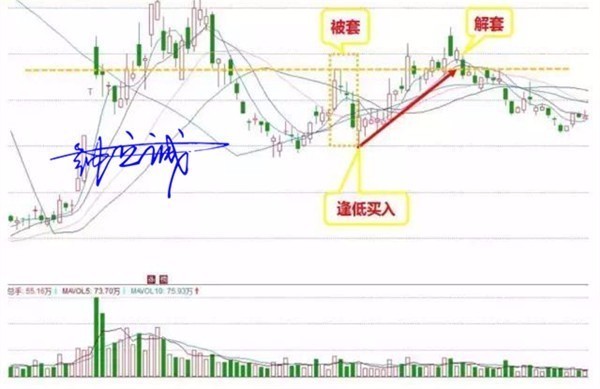 先要判断后市是向上走势!被套后,先在低点买入,等反弹到一定的高度,估计见短线高点(不一定能够到第一次入手被套的价)再出。通过这样来回操作几次,降低成本,弥补了亏损,完成解套。