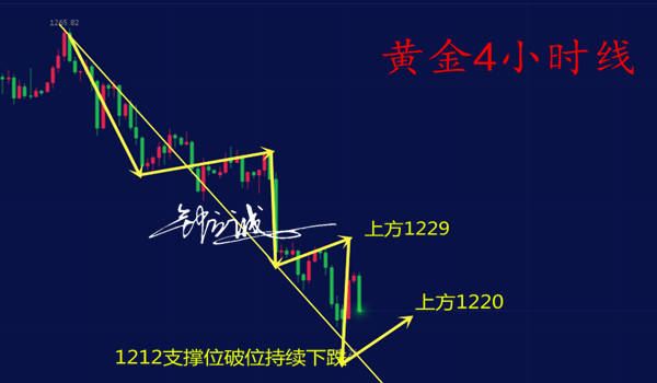 昨天策略中指出在空头趋势,激进可以1228一线布局空单,午后在1220布局空单进场,目标看向1212。亚盘下跌幅度大,预测美盘会有反弹的空间,那么我们布局的空单可以持有,当行情再次破位1215一线时,空单在1212一线获利出局。晚上1213附近多单进仓再次获利出局