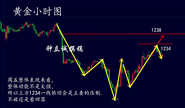 那么对于接下来的布局,目前1236的年度低点已经跌破,周线级别破位,这种破位今日的下跌只是一个起步阶段,下方还有比较大的空间,高空仍是接下来的主旋律;有朋友问立诚见底没有,这个时候去猜底其实就显得没有什么太大意义,必须要站上1245一线之后才能说这种话,那么黄金在上周这种弱势下跌,加上卖盘砸盘的行情,技术指标基上偏离,不用过多参考,只用参考一点,大趋势是空,上方压力位置就是前期低点1236一线以及开跌口1240一线的压力,重点关注顶底转换位置1236一线的压力即可,至于下方支撑位置则先重点关注1210一线,前底不可言,只能说新的空间已经打开,保持1240之下看空思路。