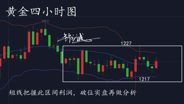 4小时上,短期有1236双顶压制,昨日下行快速下探1214的同时反弹也更加迅猛,最高触及1228美元一线,但最后重回开盘价1223收尾,典型的区间震荡行情。那么今天是继续重复上演,还是彻底分道扬镳。我们还需要留意数据的演变情况。