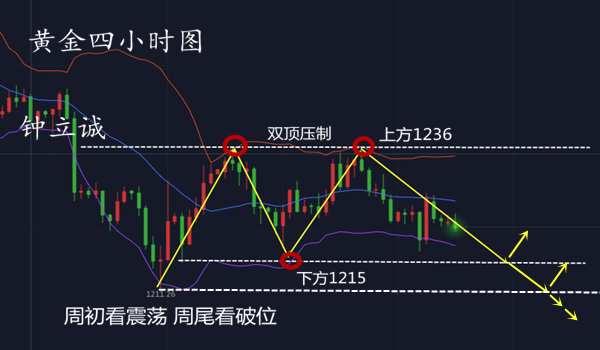 近期黄金除了震荡还是震荡,1235-30高点至1215-11低点区间不断往复循环,虽然每日波幅不大,综合来看行情短期仍是空头主导的局面不过下跌力度已经有所减缓,多头上涨又毫无延续性筑底更是缺乏消息,