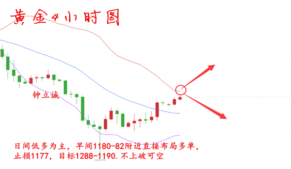 黄金日间策略:日间低多为主,早间1180-82附近直接布局多单,止损1177,目标1288-1190.上方关键阻力位1194-95.不破做空看回调,上破看1200。